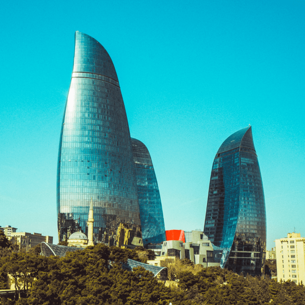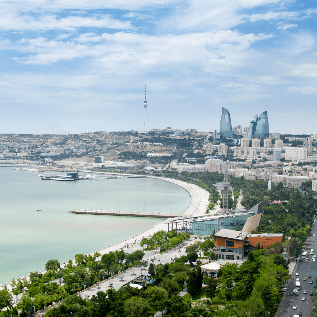 Baku has a beautiful skyline with a combination of tall modern buildings and old landmarks. You can see impressive structures like the Flame Towers and the Maiden Tower, which tell stories about the city’s history and how it is today.